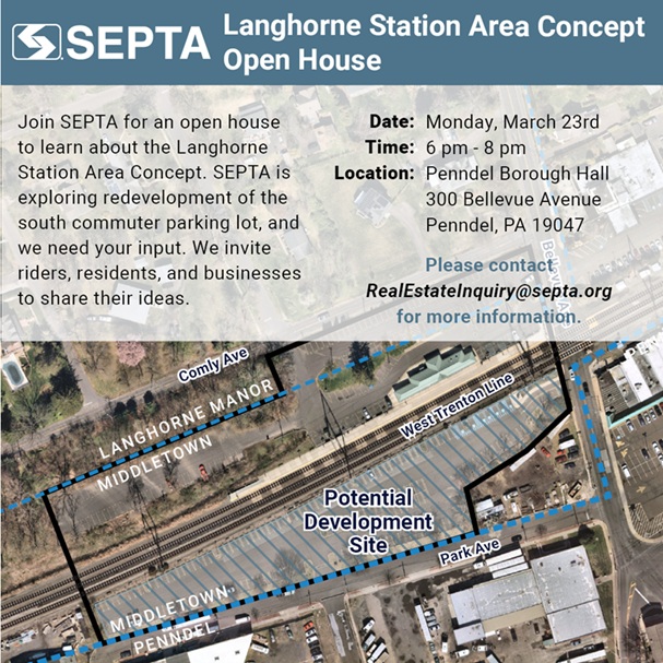 SEPTA will be holding a Langhorne Station Area Concept Open House on March 23 in Penndel, Bucks County!